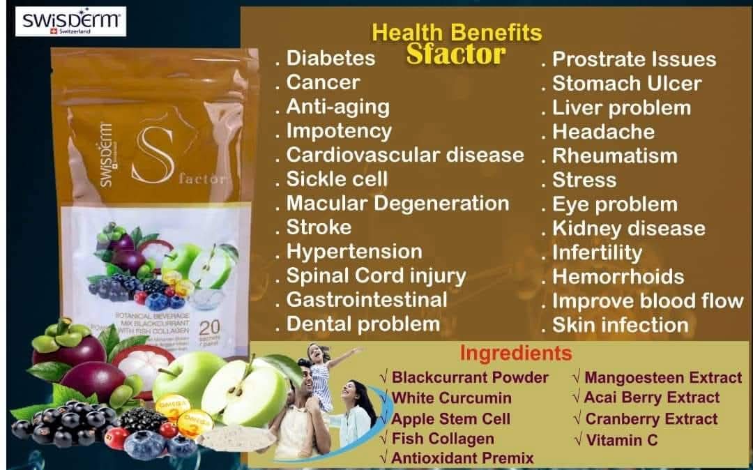 Boisson botanique avec collagène de poisson. 24 bénéfices santé : diabète, cancer, anti-âge, impuissance, maladies cardiovasculaires, drépanocytose, dégénérescence maculaire, AVC, hypertension, lésions de la moelle épinière, problèmes gastro-intestinaux, dentaires, prostatiques, ulcères gastriques, hépatiques, maux de tête, rhumatismes, stress, problèmes oculaires, rénaux, infertilité, hémorroïdes, amélioration de la circulation sanguine, infections cutanées.