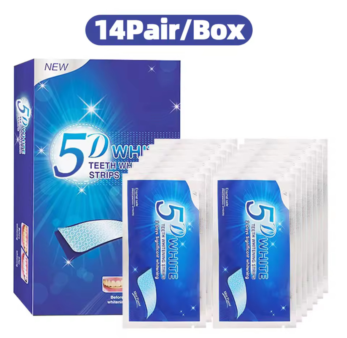 Kit de blanchiment dentaire 5D avec 14 paires de strips blanchissantes. Efficace et facile à utiliser, retire les taches et donne un sourire éclatant.